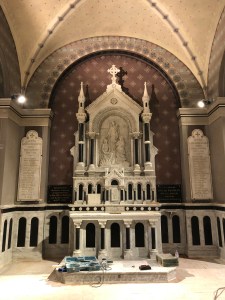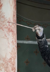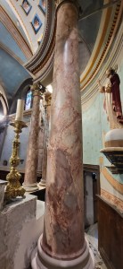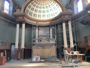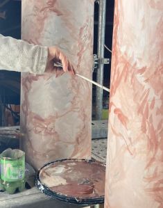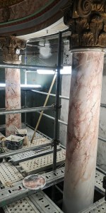 Restitution des faux marbre des colonnes du Baldaquin de l’Autel, après dépose et remise en place de colonnes neuves.